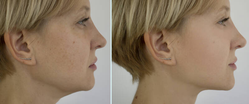 Radio Frequency was used to contour and tighten the skin. There is a visible contouring of chin.